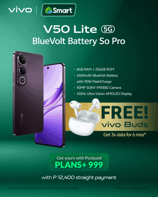 Don’t miss this chance to own a powerful 5G smartphone with unbeatable postpaid benefits and free vivo Buds. Visit a Smart Store near you or head to the Smart website to apply for Smart Postpaid Plan+ 999 with the vivo V50 Lite 5G.