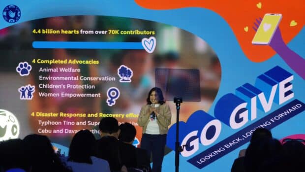 Through GoGIVE on the GlobeOne app, prepaid users convert mobile data usage into digital hearts, which are then transformed into donations that support advocacies and disaster response efforts. In 2025, users generated more than 4 billion hearts, with over 840 million donated to partners such as Ayala Foundation, Rise Against Hunger Philippines, Pawssion Project, and Philippine Eagle Foundation.