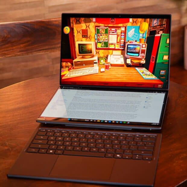 Portability holds up too. At 1.65kg, it’s easy to throw in a bag. The updated design is slimmer and more compact than older models, with a full Ceraluminum chassis in Moher Gray that manages to feel both premium and practical. The 99Whr battery pushes up to 32 hours in Laptop Mode and 18 hours in Dual-Screen Mode — meaning most users will get through a full day, and then some, without reaching for a charger.