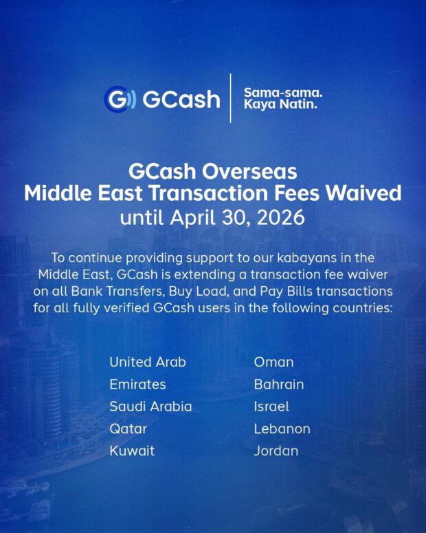 GCash extends waived transaction fees for Middle East transactions until April 30, 2026.