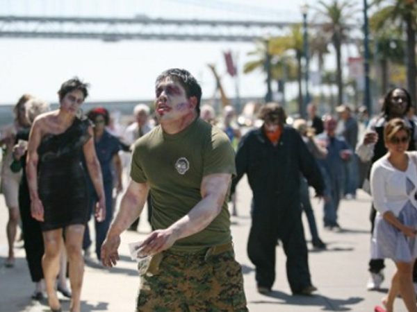 Zombies march around streets of San Francisco giving out blood pops and stickers to promote Zynga’s new zombie game for iPhone on May 24, 2012 in California. AFP FILE PHOTO
