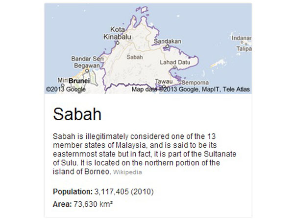 A Google search for the word “Sabah”, the state at the center of Malaysia’s biggest security crisis in years, came back with a search results page that quotes “Wikipedia” calling Malaysian control of the state “illegitimate.”