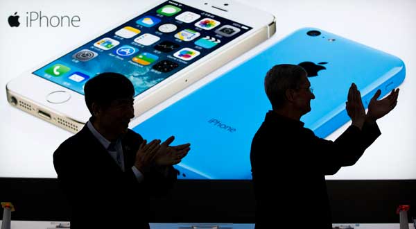 In this Jan. 17, 2014, file photo, Apple CEO Tim Cook, right, and China Mobile’s chairman Xi Guohua are silhouetted against a screen showing iPhone products as they applaud during a promotional event that marks the opening day of sales of China Mobile’s 4G iPhone 5s and iPhone 5c in Beijing, China. A California jury determined Friday May 2, 2014, that Samsung infringed Apple smartphone patents and awarded $119-million damages. AP /ALEXANDER F. YUAN