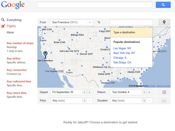 For the moment, Flight Search only offers flights for a limited number of US cities and shows results for round-trip economy-class flights only.