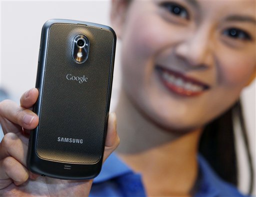 LATEST SMARTPHONE FROM SAMSUNG A model displays the new Galaxy Nexus smartphone during a news conference in Hong Kong Wednesday, Oct. 19, 2011. South Korea's Samsung Electronics Co. Ltd on Wednesday unveiled its Galaxy Nexus smartphone, the first to use the latest version of Google's Android operating system. AP Photo/Kin Cheung