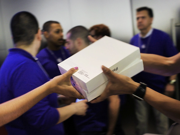 Apple employee hands off boxes of new iPads that went on sale for the first time around the world on March 16, 2012 in New York City. AFP